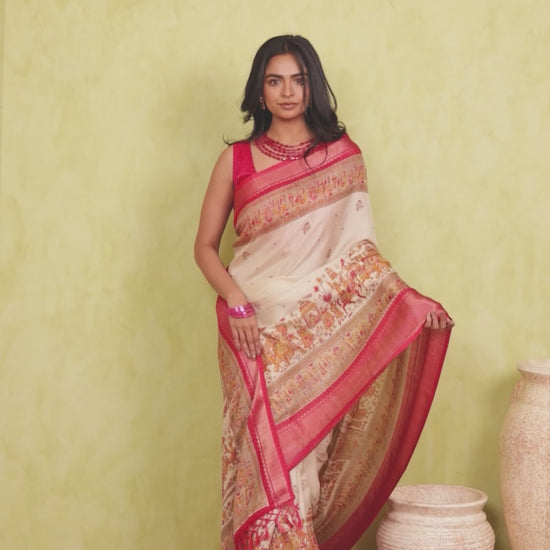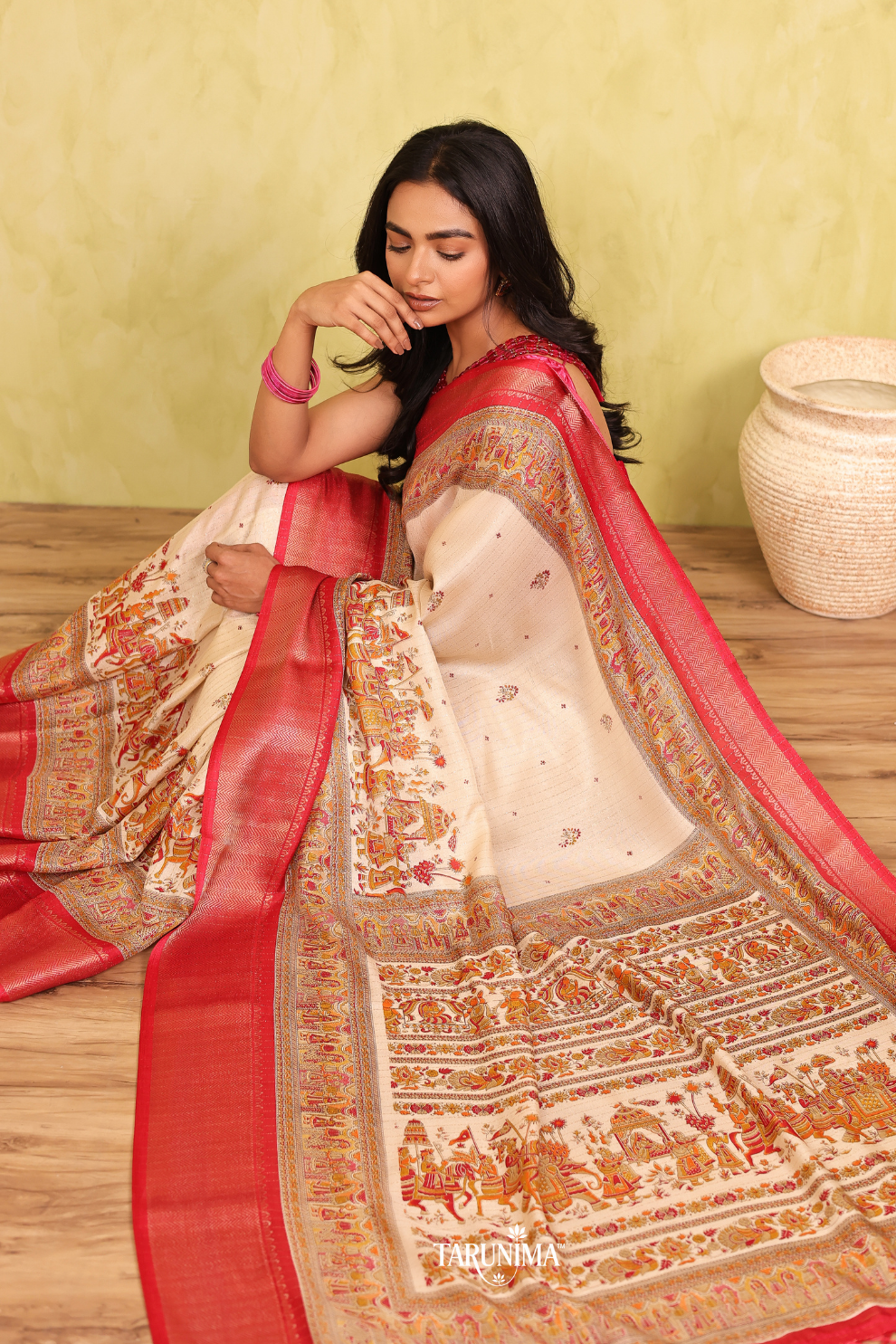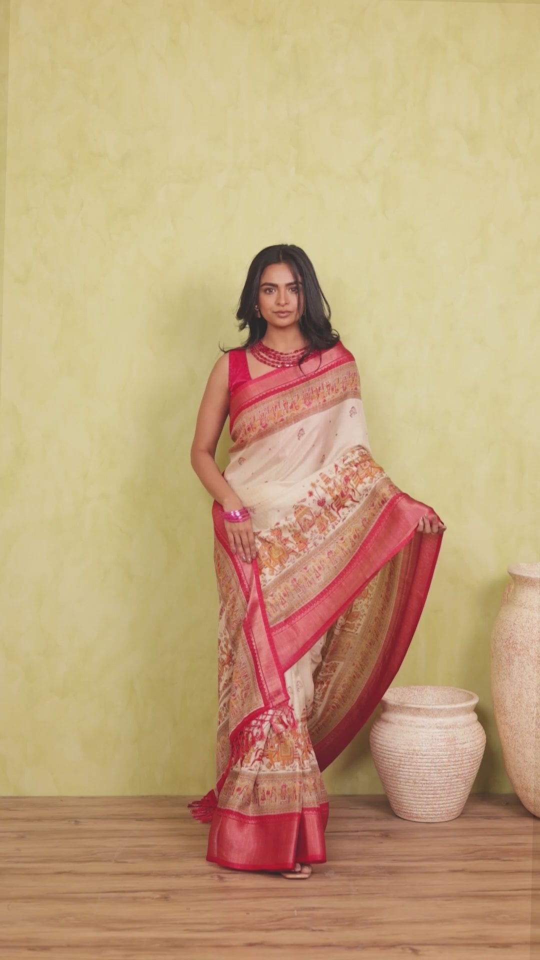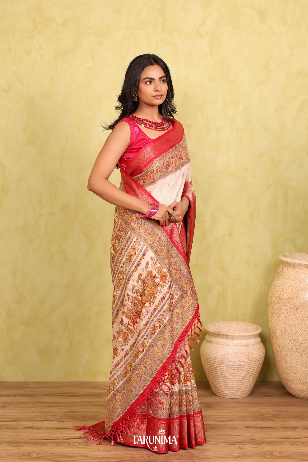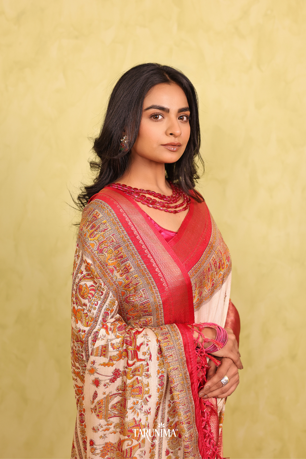 This Dola silk saree features intricate Mughlai Baraat prints accented with elegant vertical zari lining, creating a regal and sophisticated ethnic look.