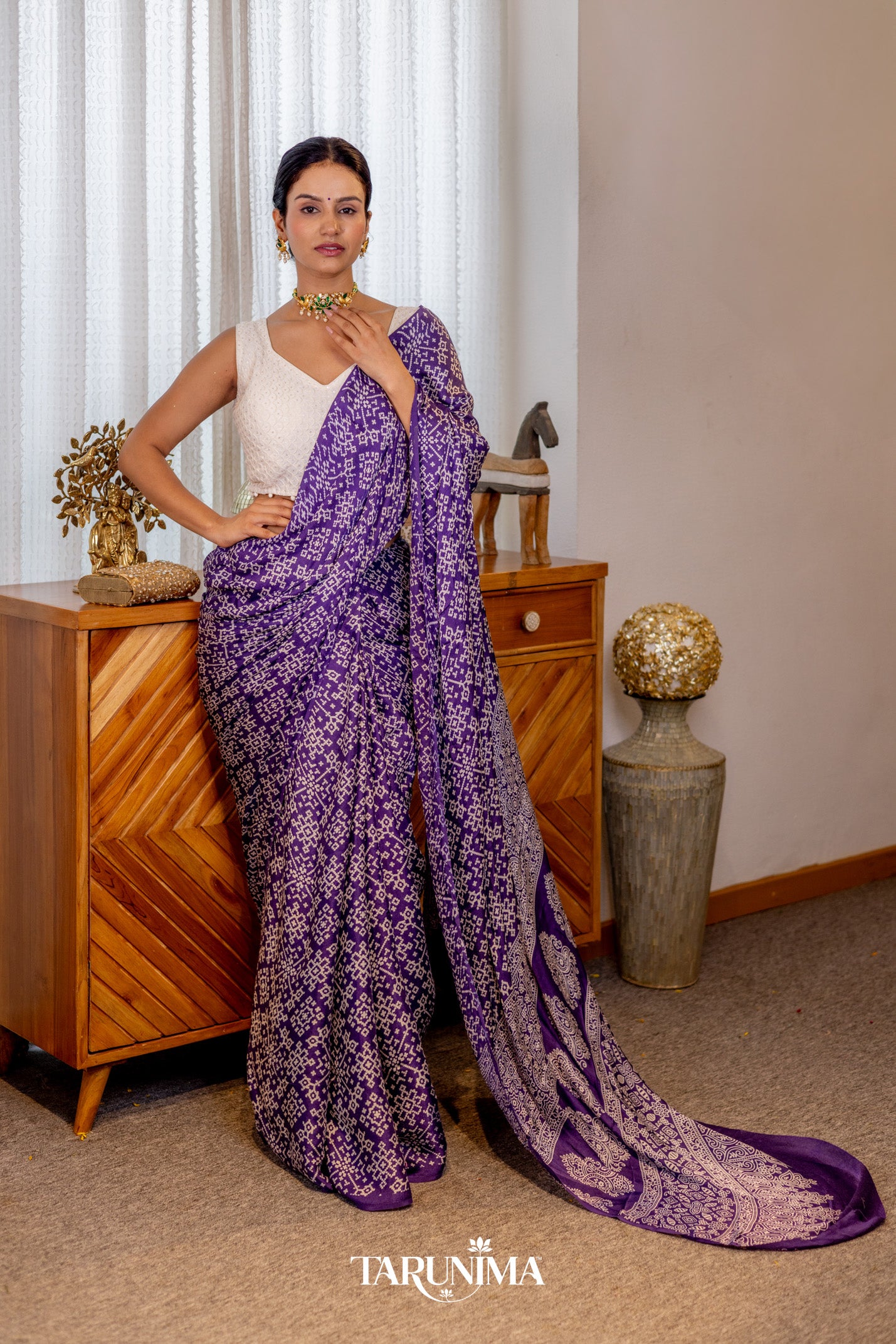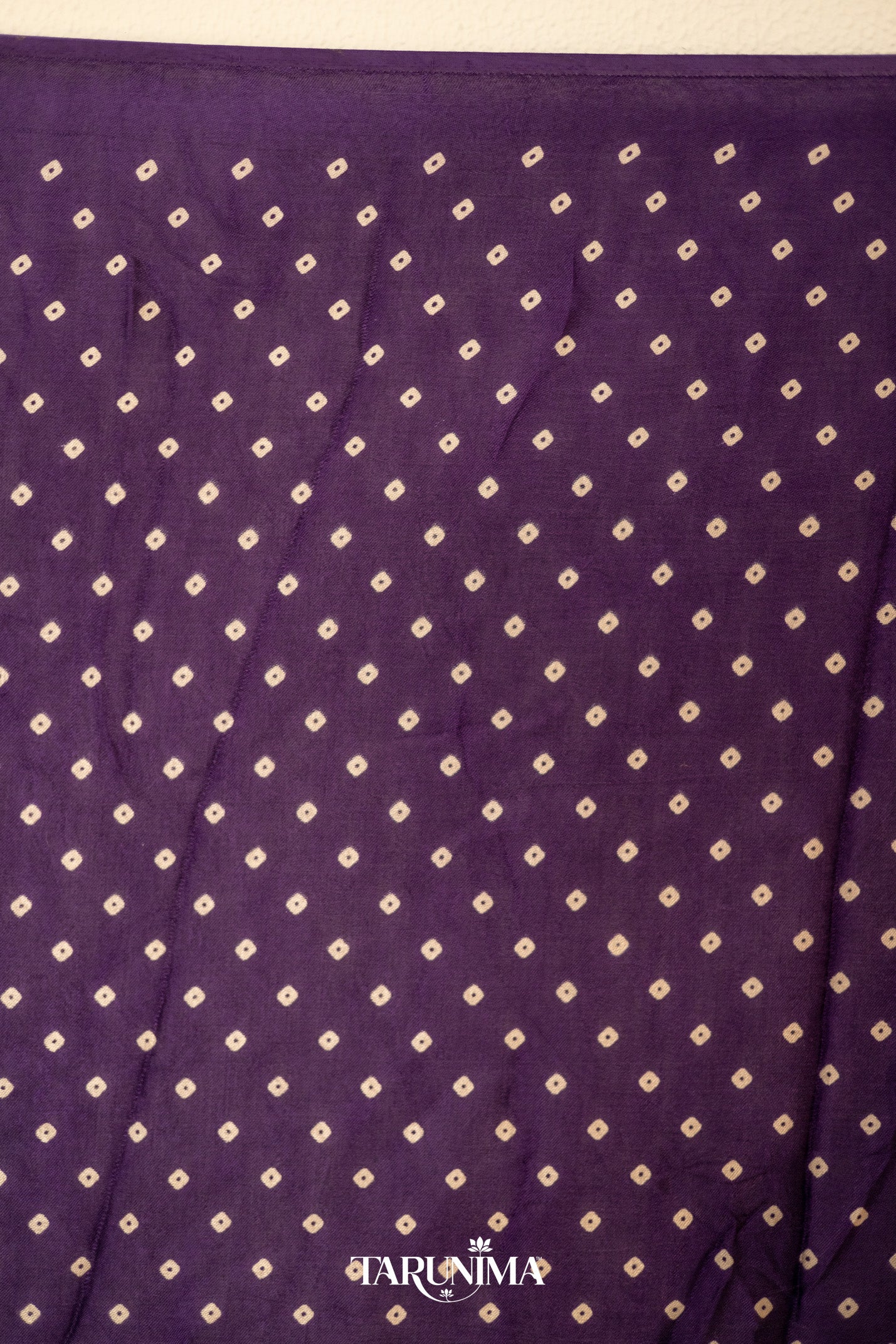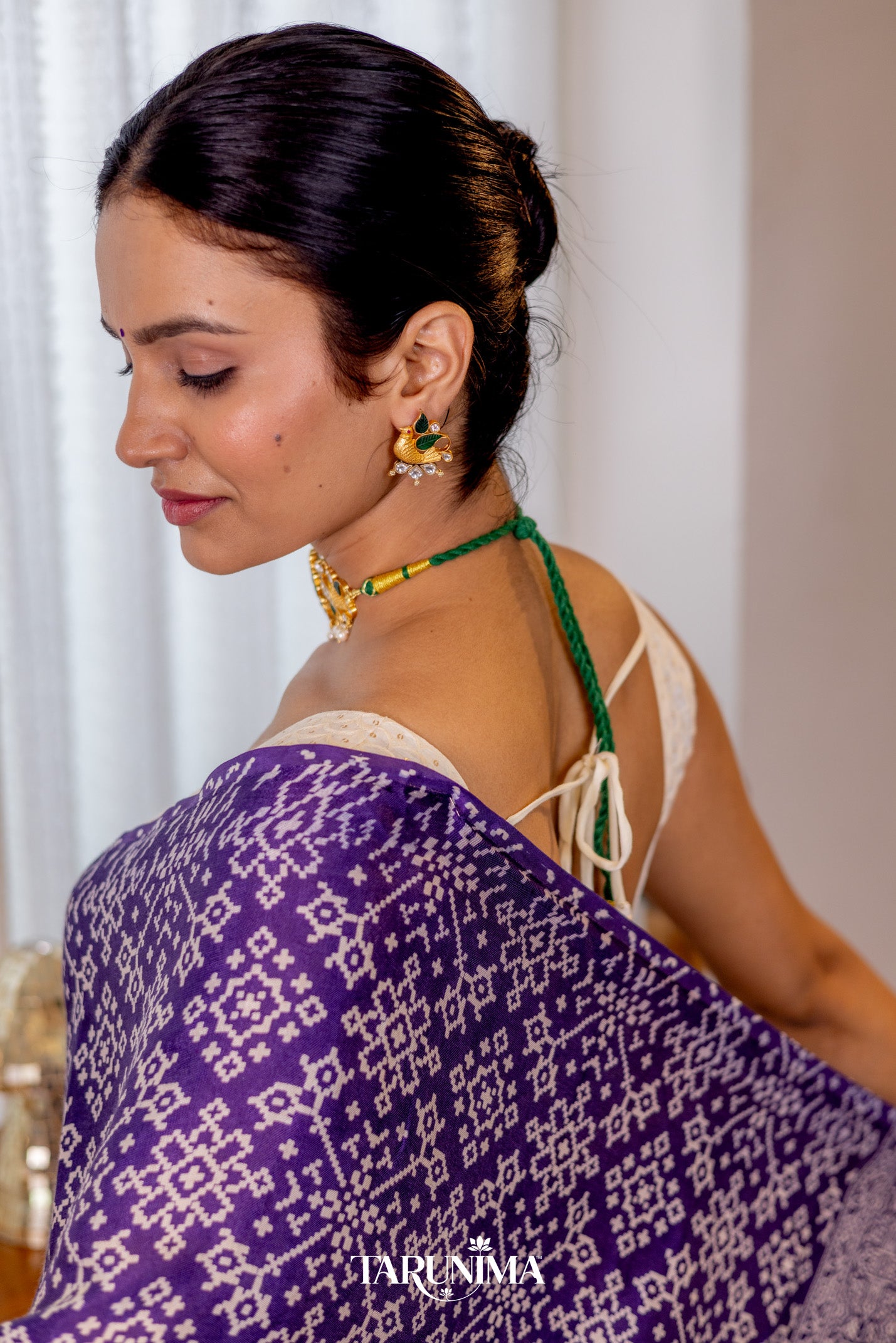 Grace yourself in a luxurious purple Gajji modal silk saree, featuring the timeless elegance of a traditional Patola print. Its soft drape and intricate design create a perfect blend of comfort and classic style.