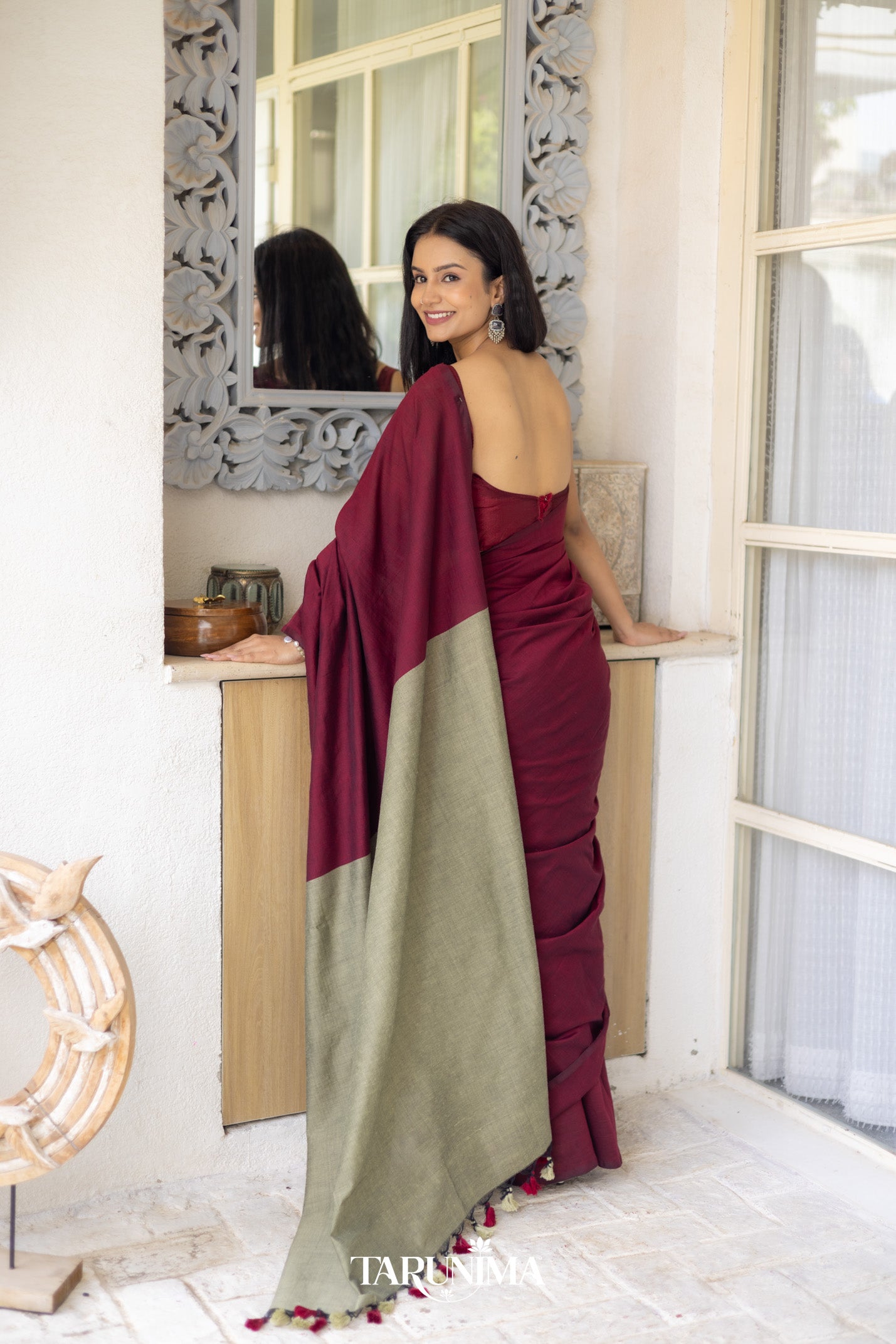 Elegant handloom cotton burgandy saree with sage colour pallu, finished with charming tassels for a touch of tradition.