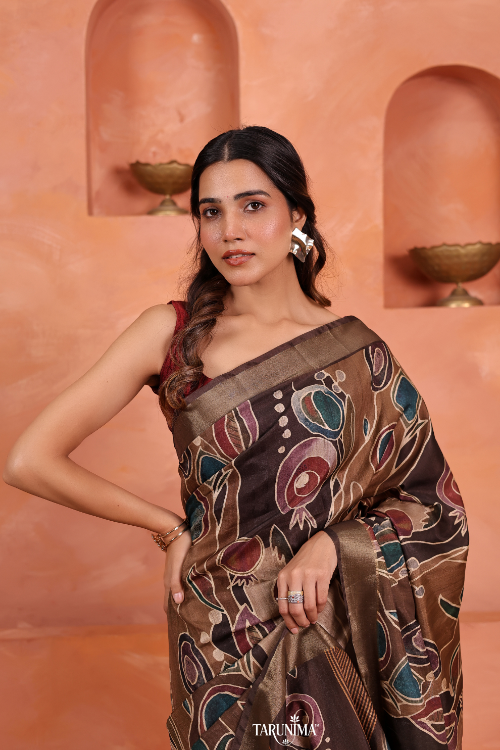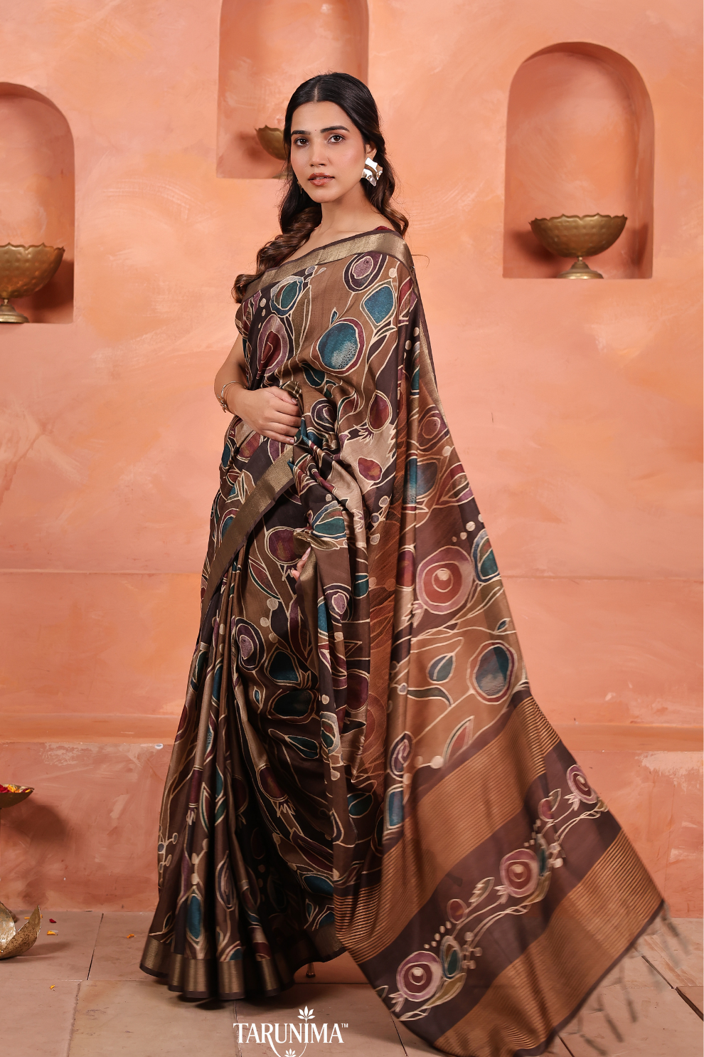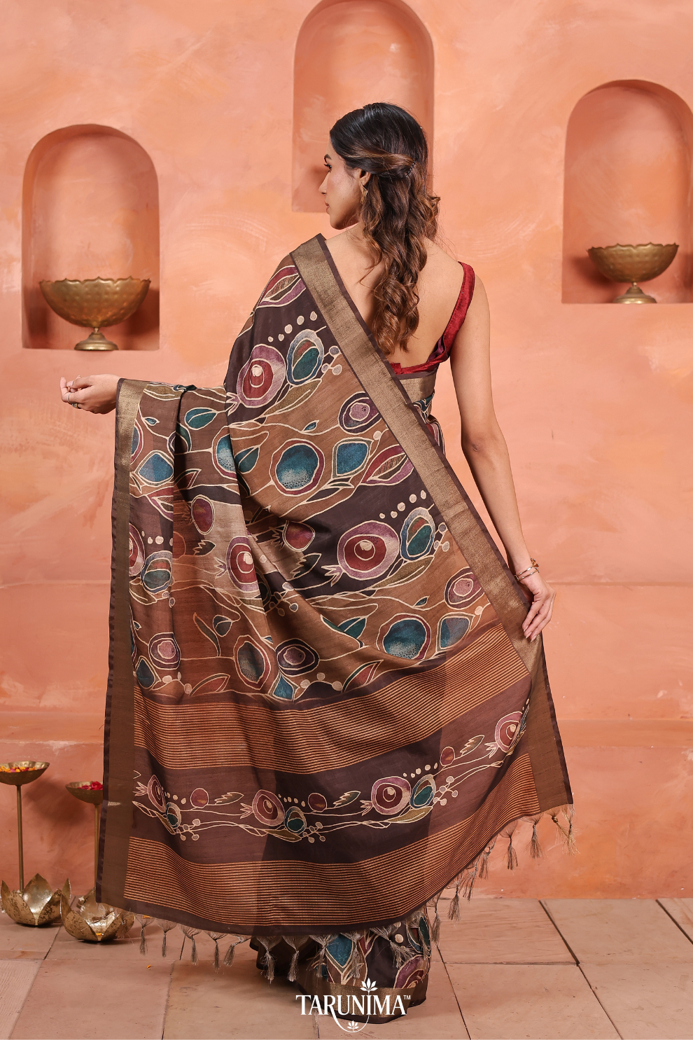 This premium Matka silk saree features a sophisticated abstract art print, merging modern artistic expression with the rich, textured elegance of Matka silk.