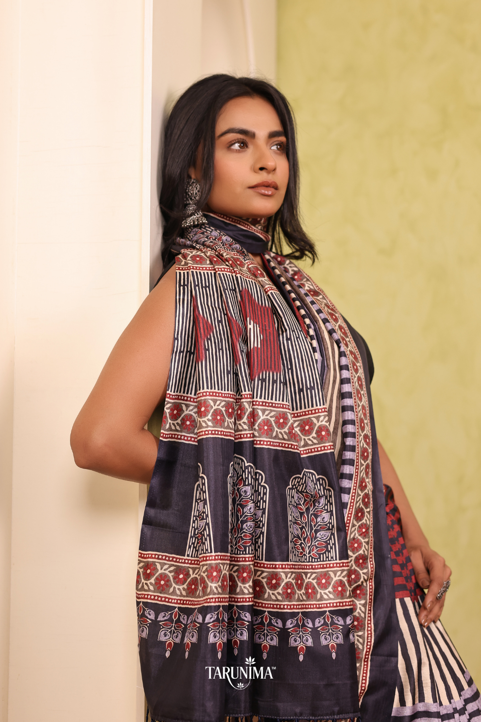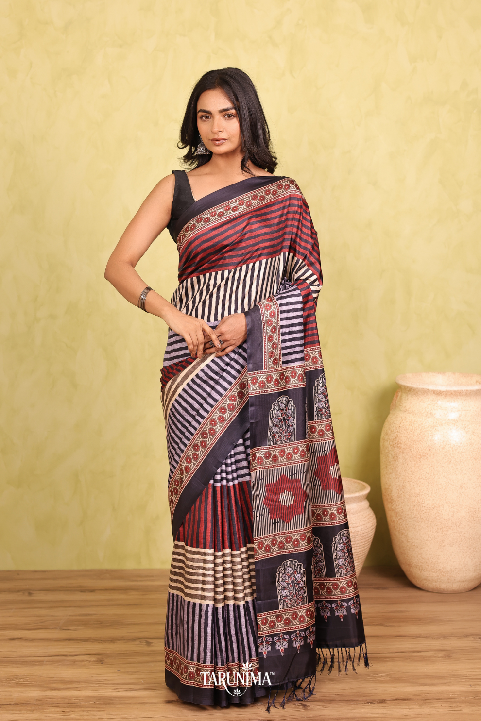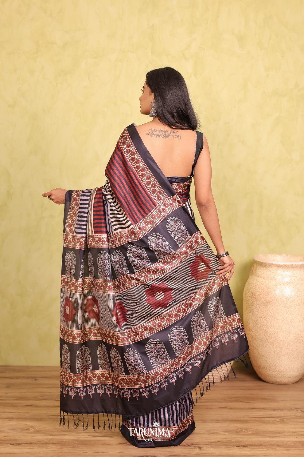 This soft Messi silk saree is adorned with a contemporary geometrical print design, offering a stylish and modern appeal with a smooth, elegant drape.