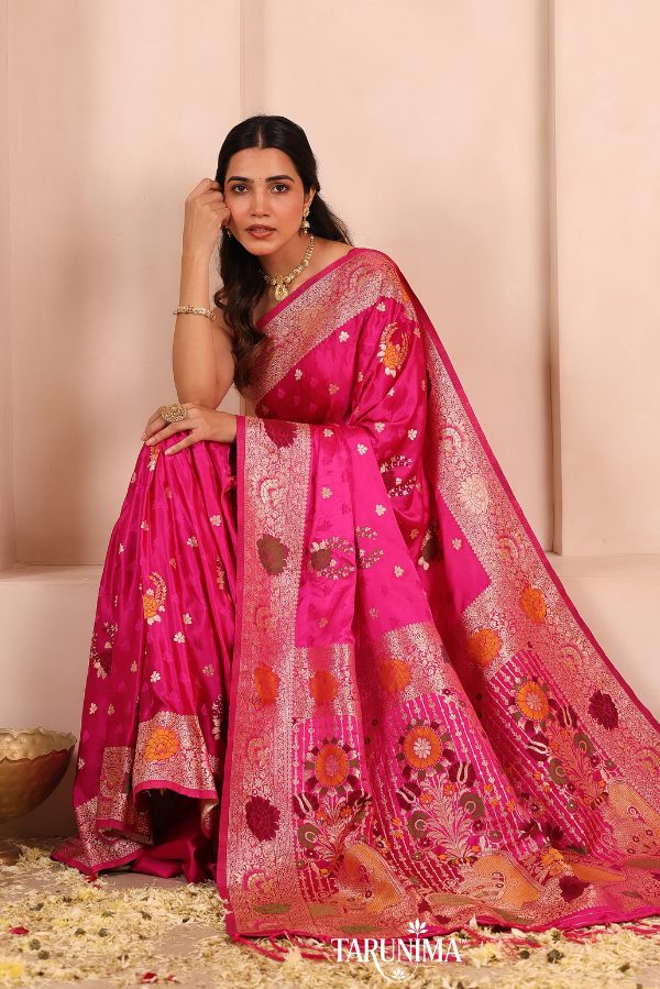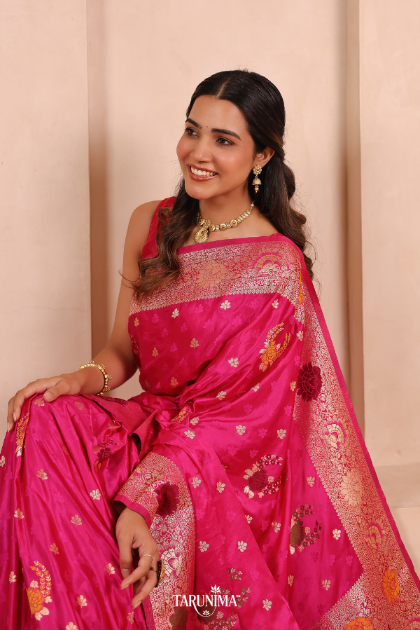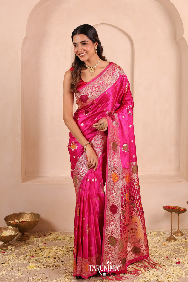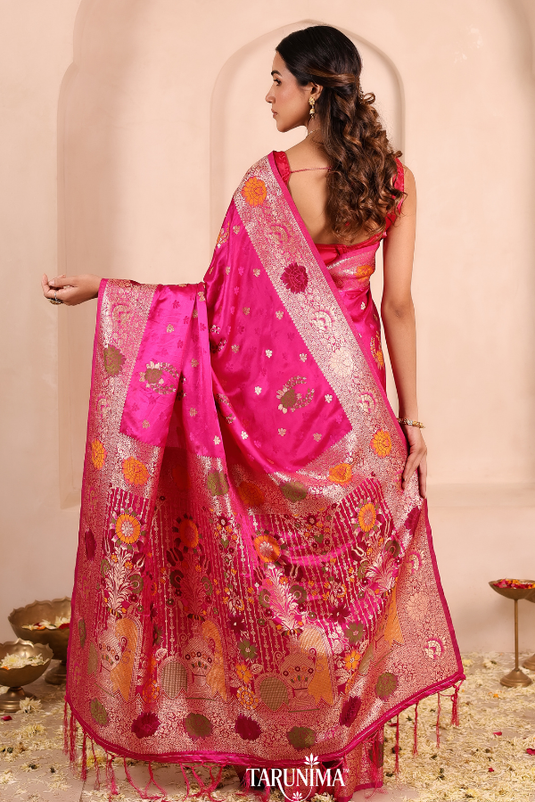 This Banarasi satin silk saree showcases a self-jacquard pattern complemented by intricate Minakari zari weaving, creating a rich and elegant traditional look.