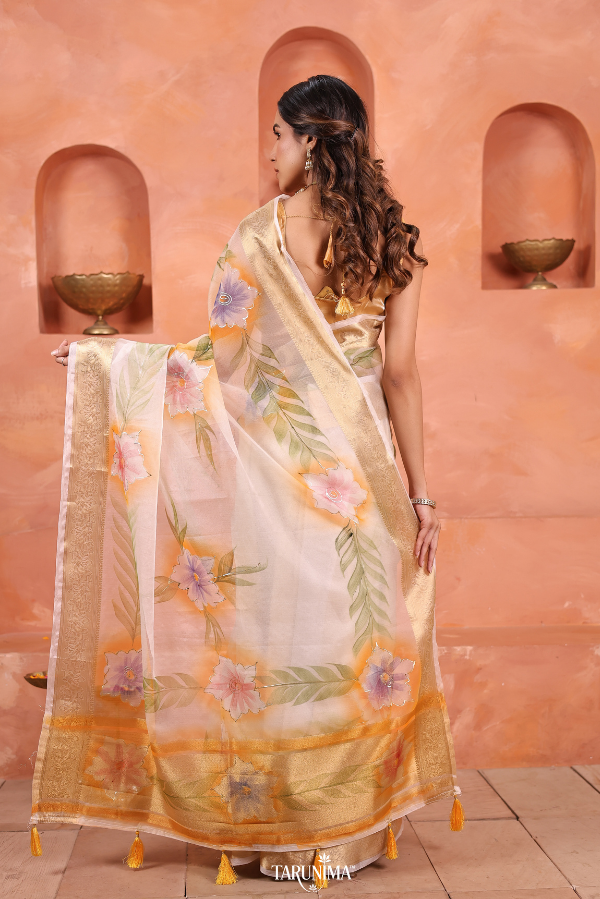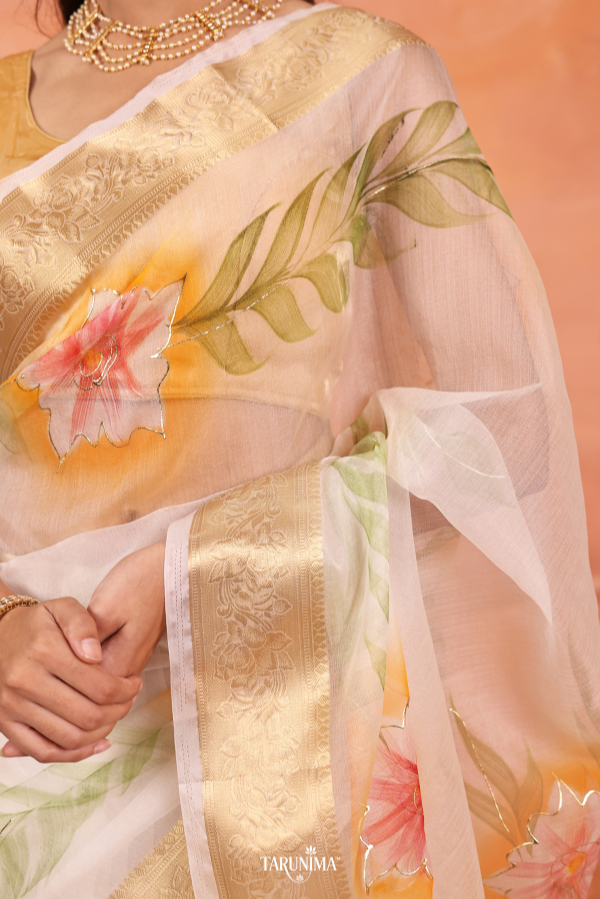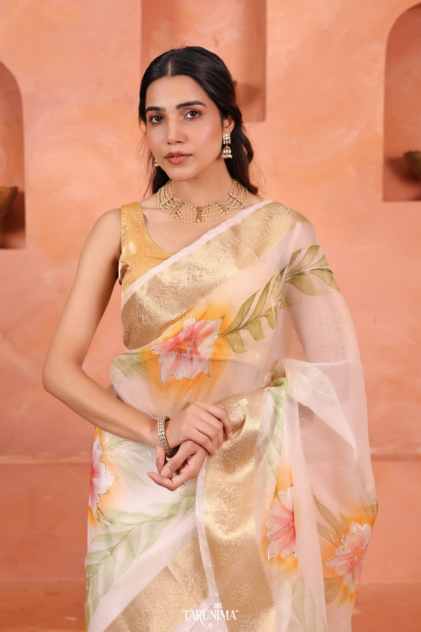 This tissue organza saree showcases a delicate floral spray print, offering a lightweight, airy drape with a graceful and elegant ethnic appeal.