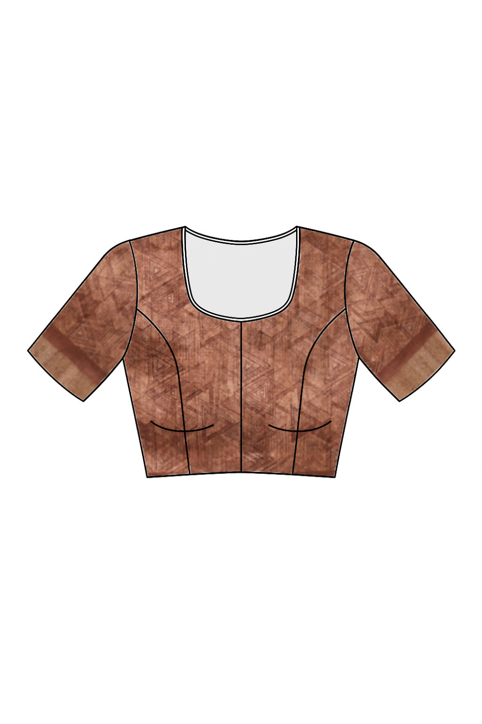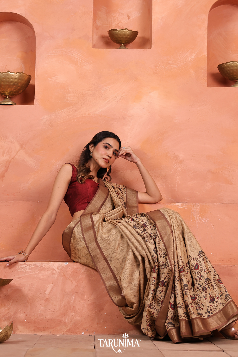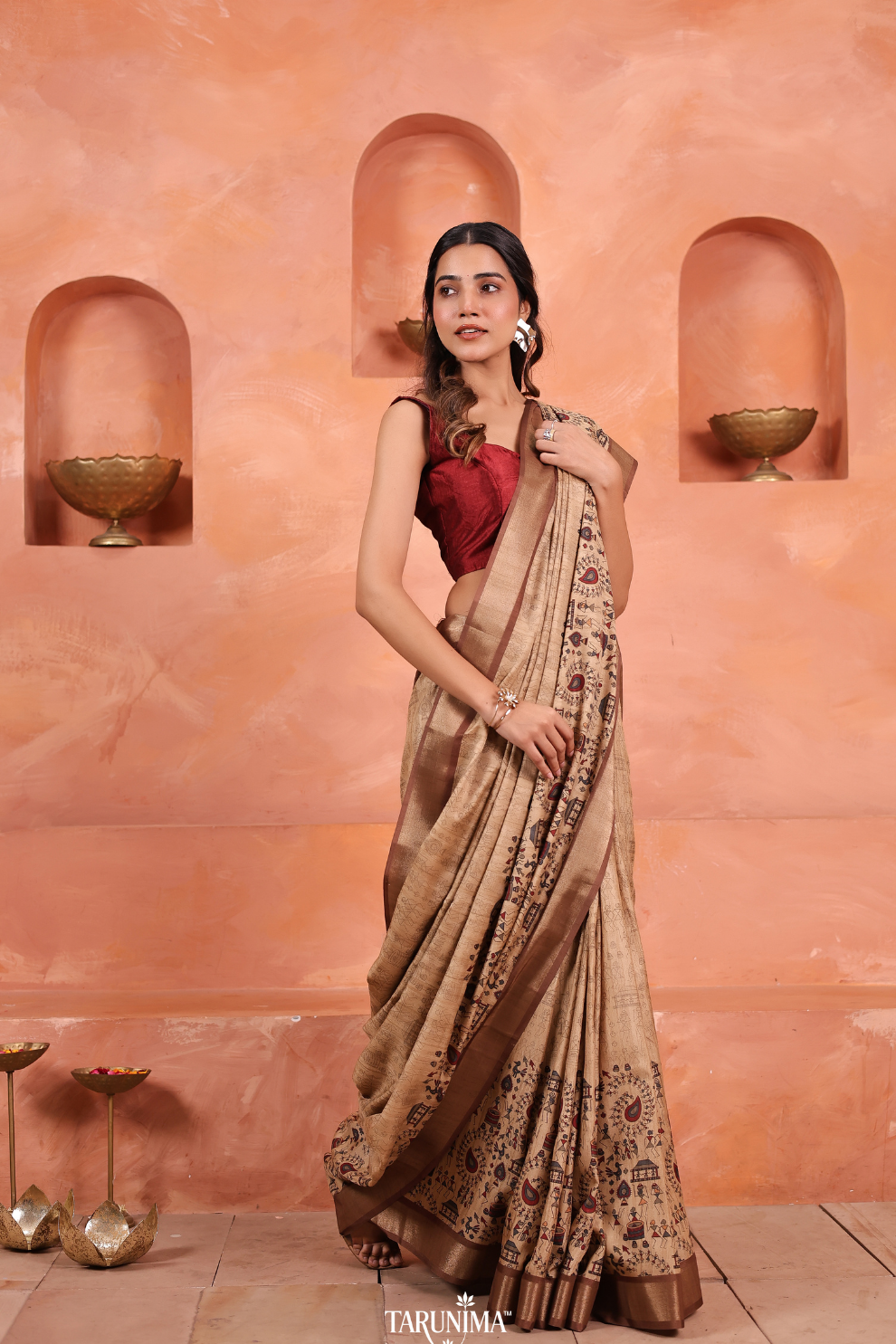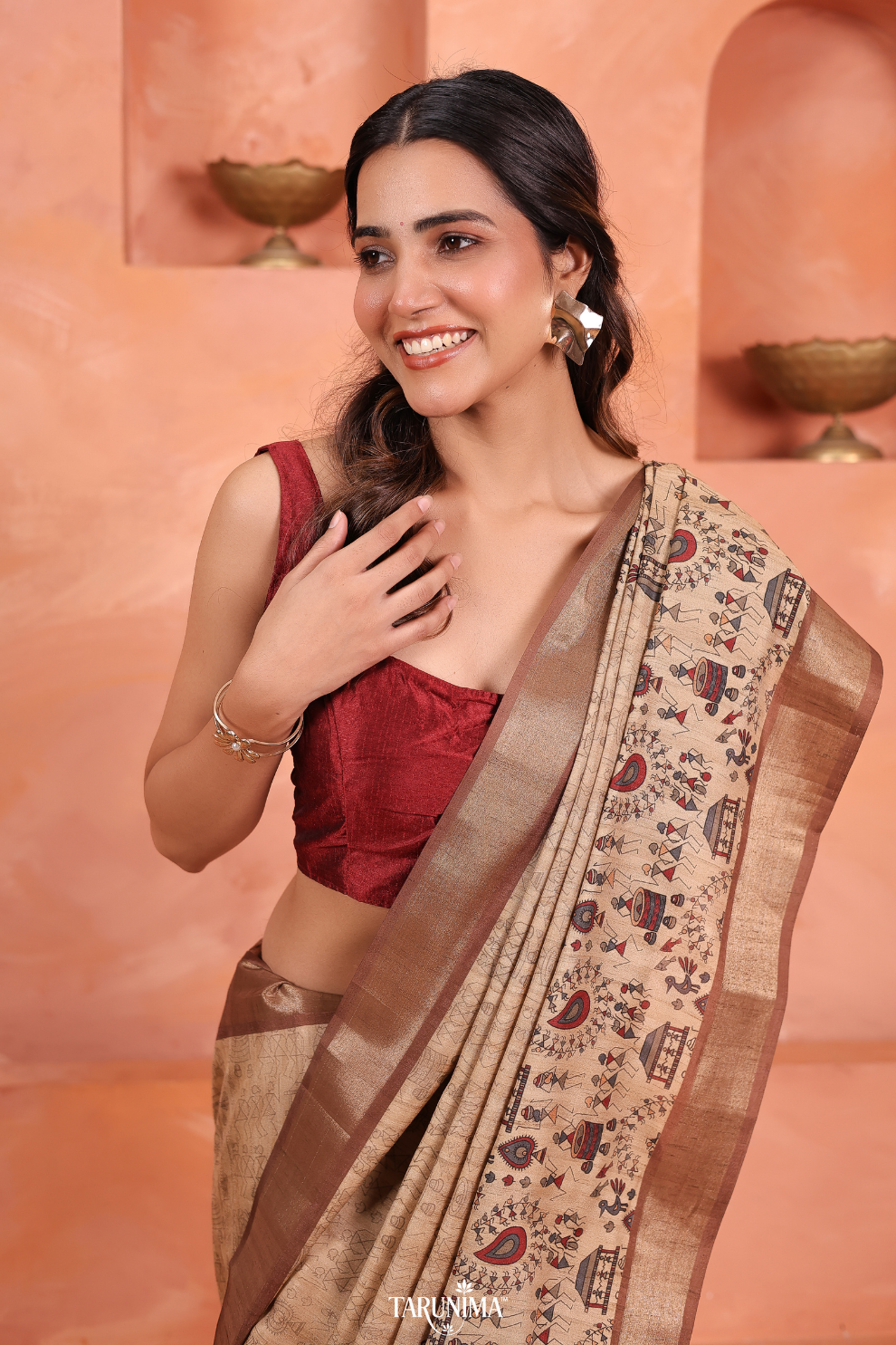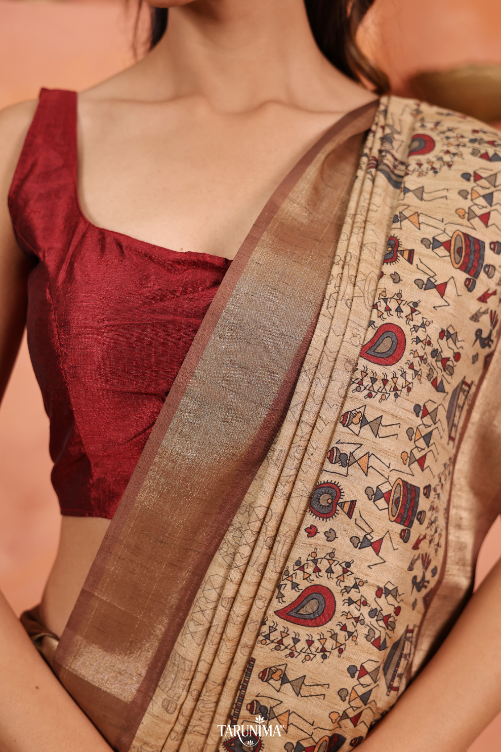 This premium Matka silk saree features captivating Warli art prints, blending traditional tribal artistry with the rich texture and elegance of Matka silk.