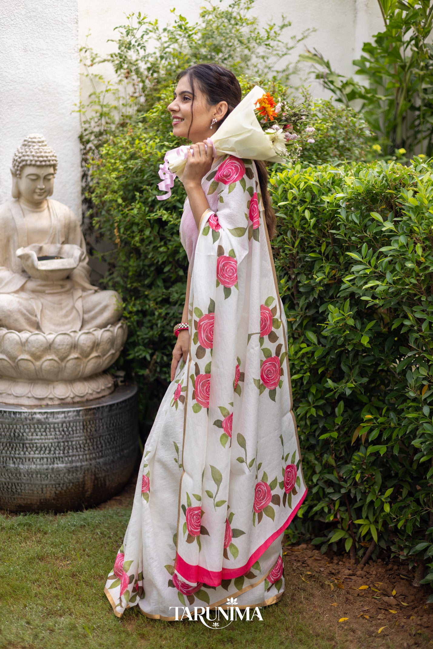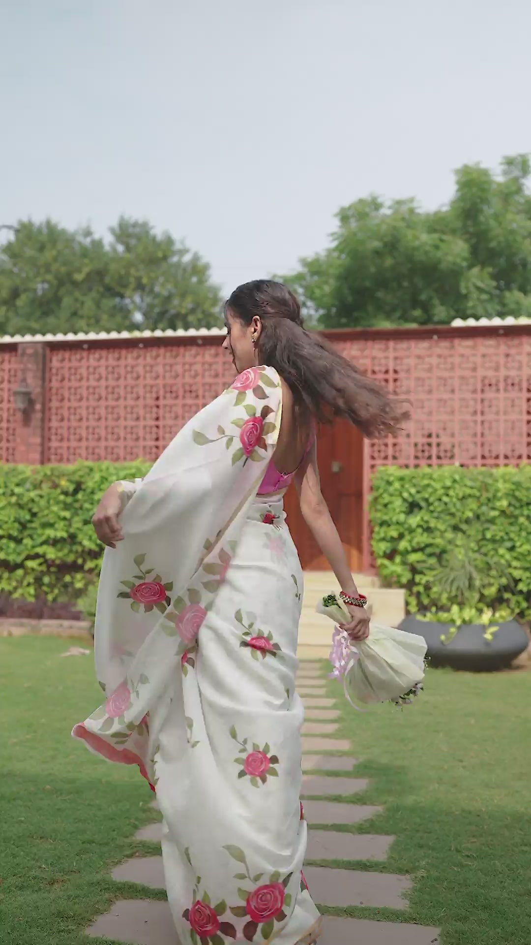 Chic and graceful, this white crepe chiffon saree is highlighted by soft pink rose prints, offering timeless elegance with a romantic charm.