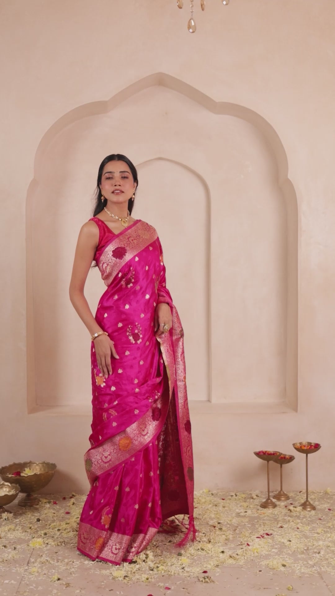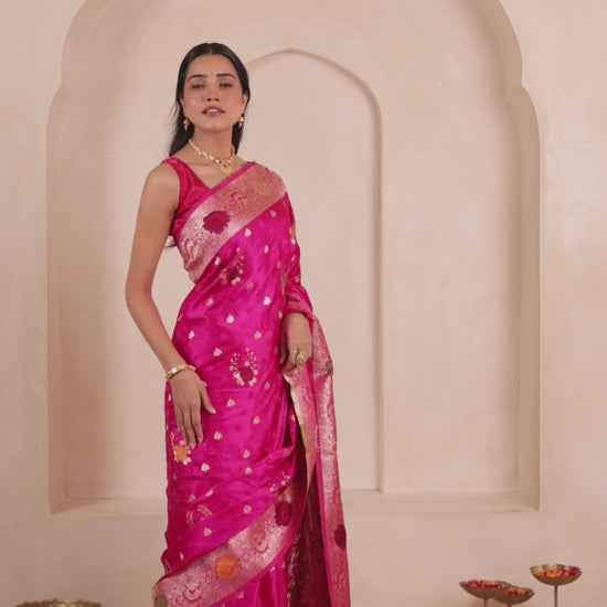This Banarasi satin silk saree showcases a self-jacquard pattern complemented by intricate Minakari zari weaving, creating a rich and elegant traditional look.