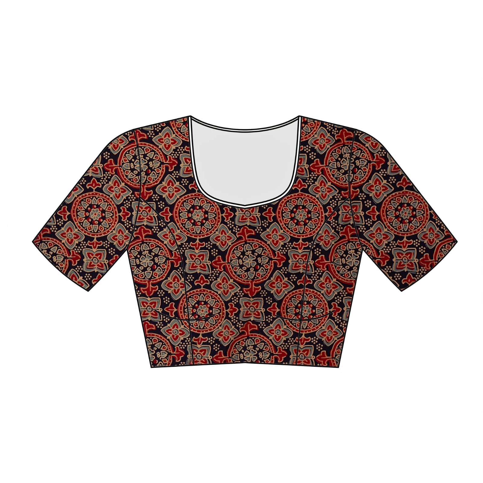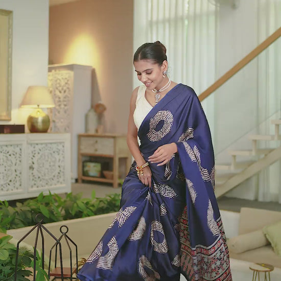 This blue modal satin saree beautifully combines motif and Ajrak prints, offering a luxurious drape with a touch of traditional artistry—perfect for festive and special occasions.