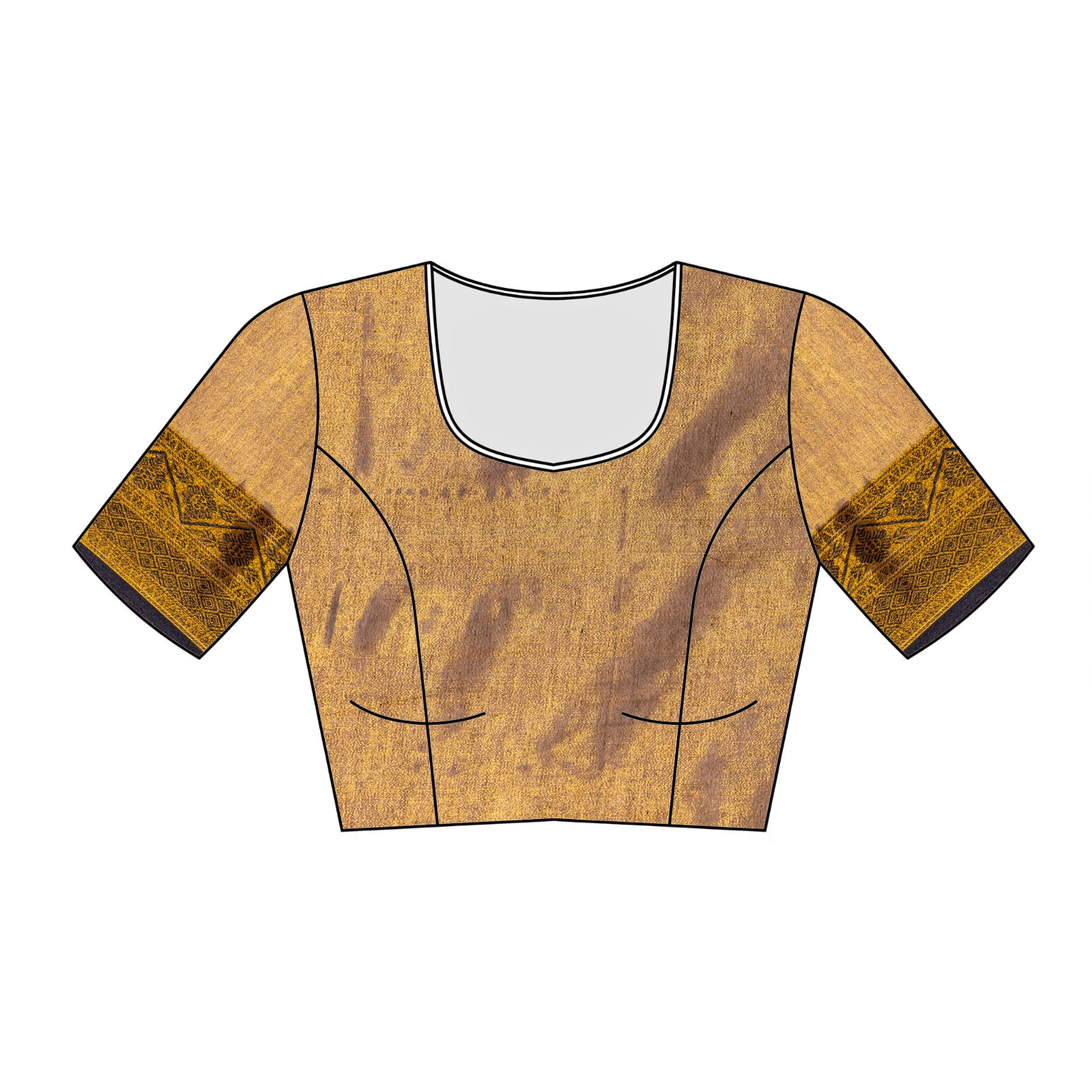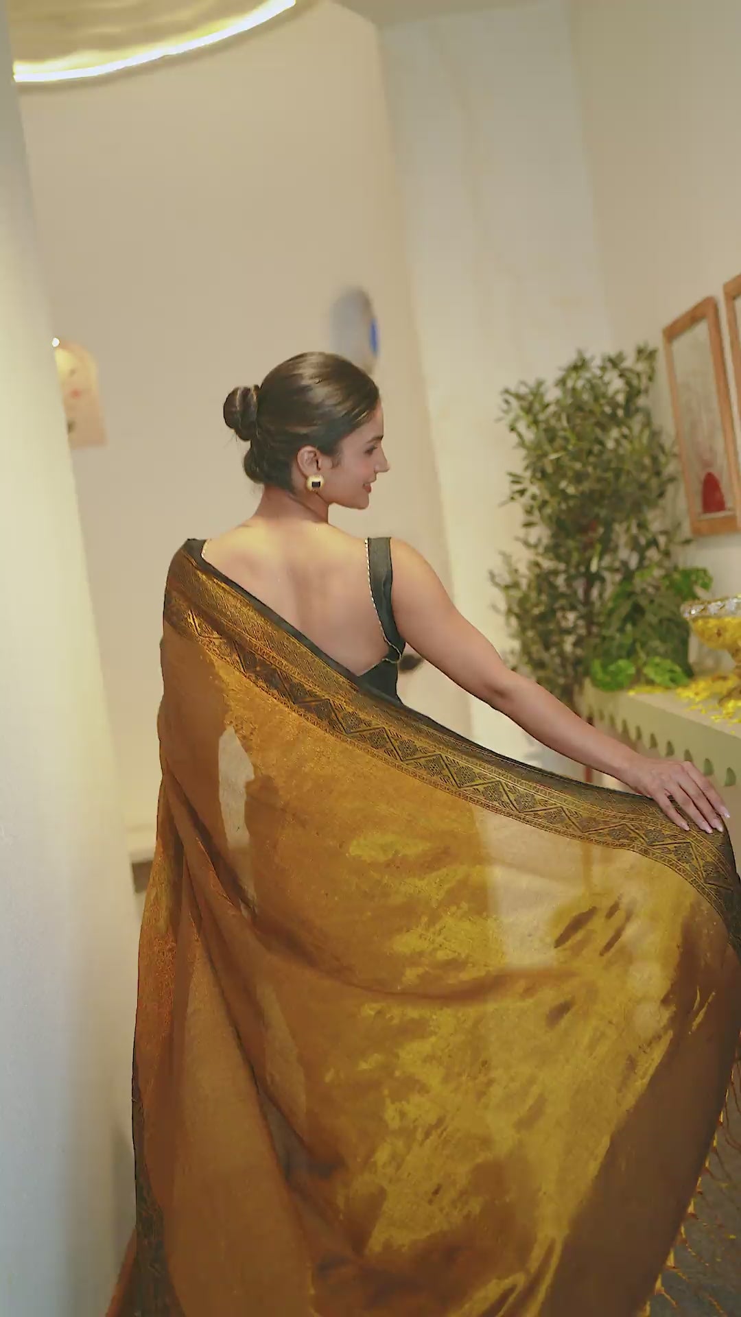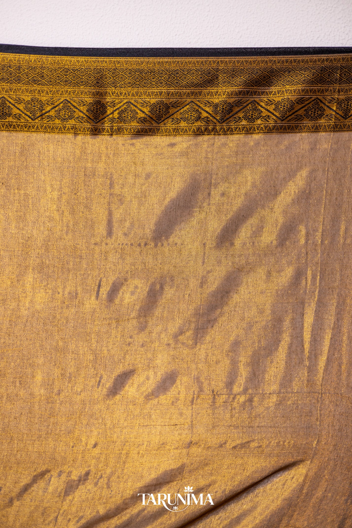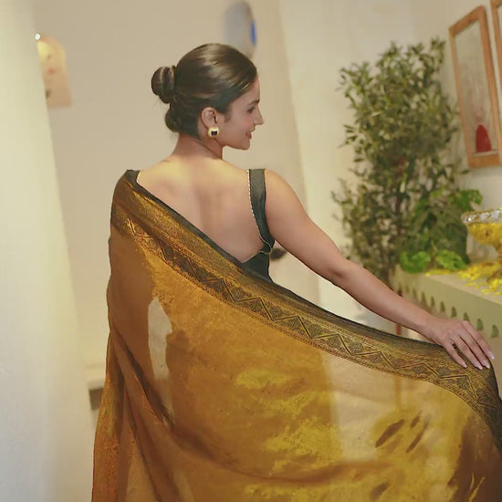 Radiant golden shimmer tissue saree, beautifully complemented with a rich Banarasi weave pallu for a regal festive look.